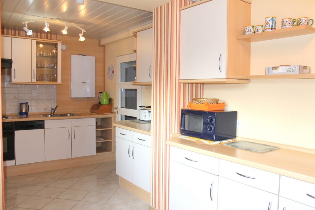 Vom Wohn- / Esszimmer aus gelangen Sie in die große Küche, diese ist u. a. mit Geschirrspülmaschine, Mikrowelle, Backofen und vielen weiteren Küchengeräten ausgestattet – eine Terrassentür geleitet Sie auf die zweite Terrasse. Das Badezimmer ist mit Dusche / WC und Waschtisch ausgestattet. Zwei der drei Schlafzimmer sind mit einem Doppelbett sowie einem Kleiderschrank/Kommode versehen. Das dritte Schlafzimmer ist mit einer Doppelschlafcouch und Kleiderschrank ausgestattet, hier gibt es auch noch ein zusätzliches Waschbecken. Bettwäsche ist mietbar, Handtücher und Geschirrtücher sind bitte mitzubringen.