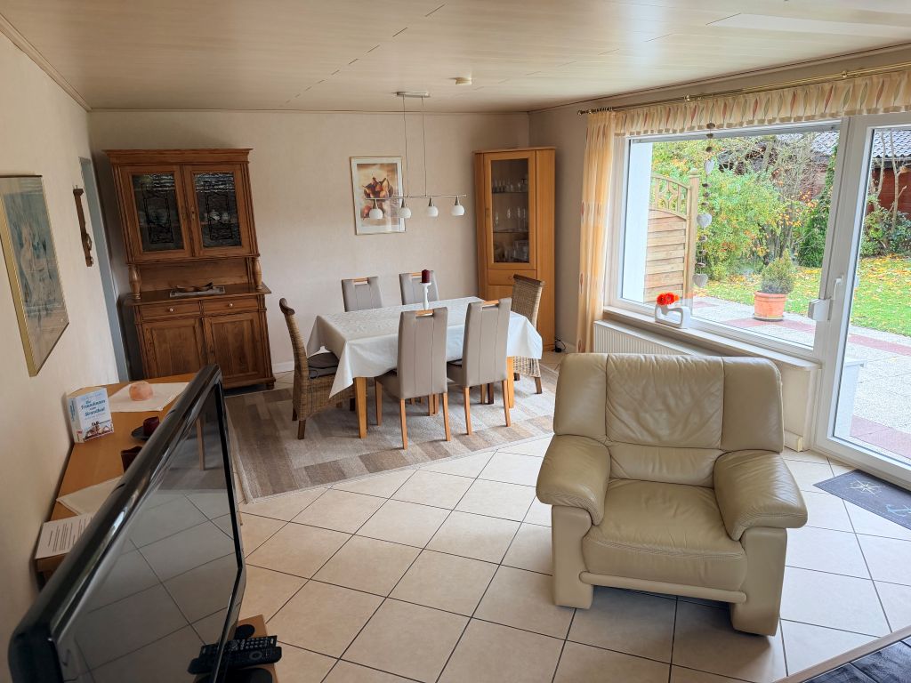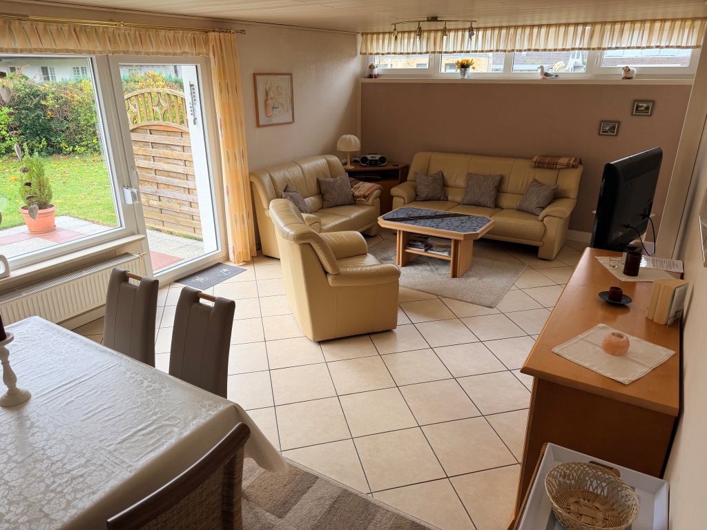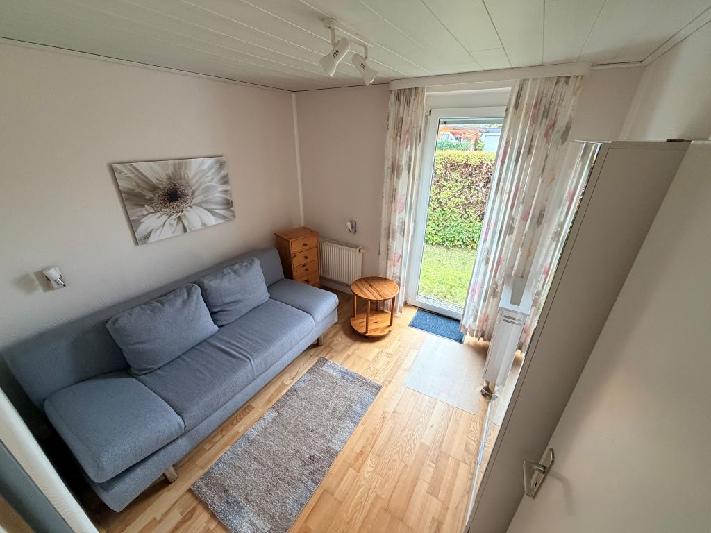 Der Wohnbereich ist mit einer gemütlichen Sitzecke, TV und einem Essplatz versehen – von hier aus haben Sie Zugang zu einer der beiden Terrassen sowie zum großen eingezäunten Garten. Gartenmöbel sind vorhanden.